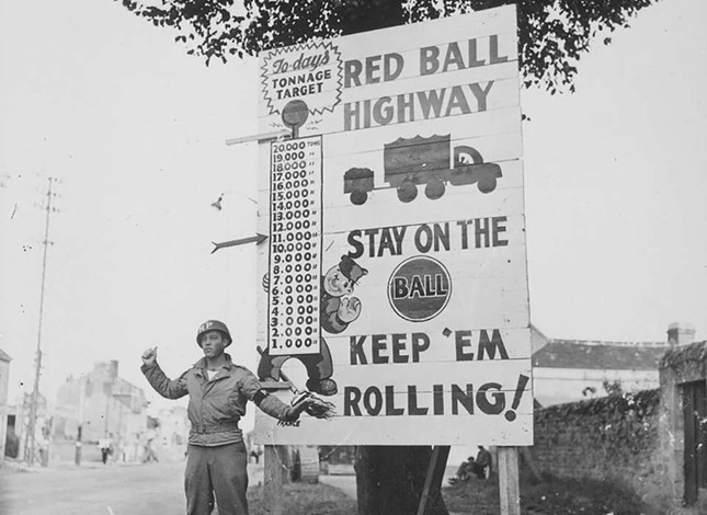 The term “Red Ball” originated in 1892 with the Santa Fe railroad and referred to expedited shipping used to move high priority goods like perishables on rail lines marked with red balls. The term “Red Ball Express” was then aptly applied to the trucking convoy that is responsible for supplying the success of the American and Allied forces toward the end of WWII.