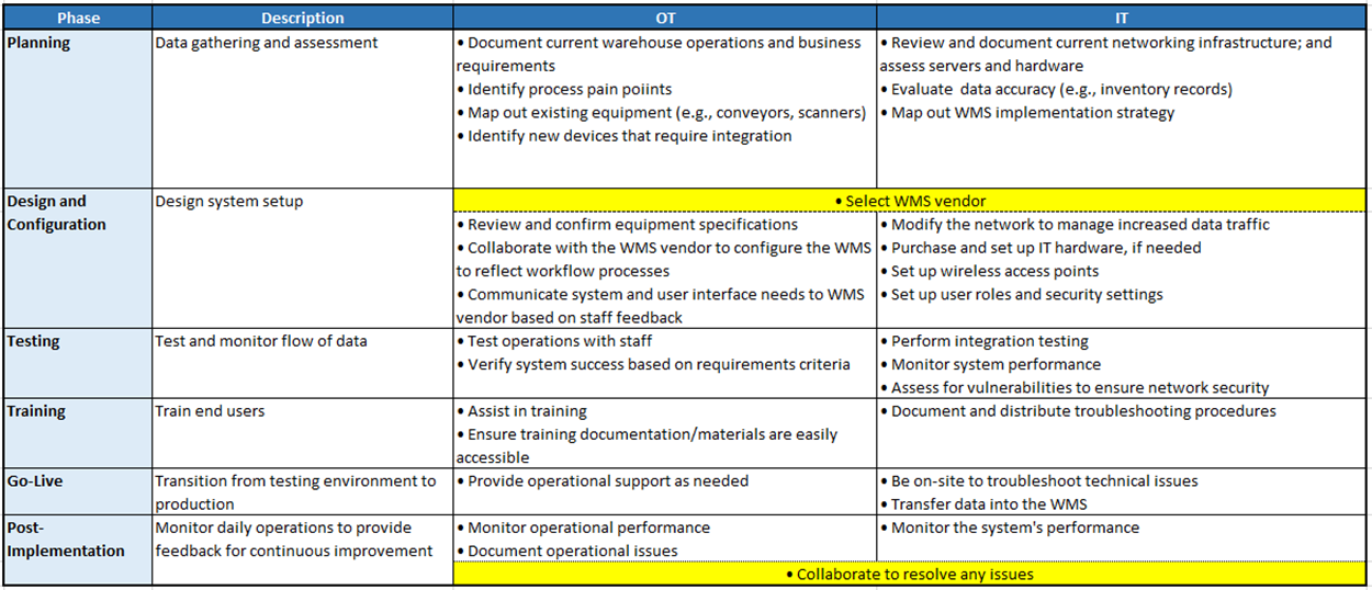 Warehouse Management System (WMS) implementations entail continuous collaboration between both operational technology (OT) and information technology (IT) personnel. It is critical for senior leadership to have a deep understanding of their differences and unique requirements to create the environment for a successful implementation. The IT team’s primary objective is data management, software applications, and cybersecurity while ensuring the integrity and accessibility of data to support business operations. However, the OT team’s core objective is to oversee warehousing processes and devices in the supply chain and material handling industry. OT and IT team collaboration brings operational efficiency and improved productivity, and should be engaged at specific, strategic points throughout a WMS implementation. OT teams should be responsible for defining functional needs. IT teams are essential for determining technical success. See the OT/IT engagement throughout the various WMS implementation timeline phases in the table below: